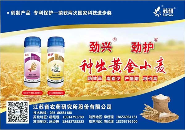 (2)選擇高效藥劑。綜合考慮藥劑對赤霉病防治效果和真菌毒素控制效果,以及對銹病、白粉病等葉部病害的兼治作用等因素,選擇滲透性強、耐雨水沖刷、持效性好的高效對路農藥。交替輪換使用不同作用機制的藥劑,提倡使用復配制劑,避免或延緩產生抗藥性。對多菌靈產生抗藥性的地區,慎用多菌靈及其復配制劑。防治赤霉病選擇氰烯菌酯·戊唑醇、丙硫菌唑、丙唑·戊唑醇、氟唑菌酰羥胺+丙環唑、氰烯菌酯+戊唑醇等,防治白粉病、銹病選用丙環唑、腈菌唑、氟環唑等,防治紋枯病選用加噻呋酰胺、井岡霉素A,防治穗蚜選用吡蚜酮、噻蟲嗪等。