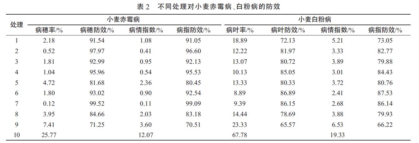 試驗結果表明(表2),480g/L氰烯·戊唑醇SC750 mL/hm2和1125 mL/hm2、30%氰烯·丙硫SC600 mL/hm2和750 mL/hm2、40%丙硫·戊唑醇SC600 mL/hm2以及20%氟唑菌酰羥胺SC+250g/L丙環唑EC(1050+450) mL/hm2對小麥赤霉病防效十分優異,病穗防效、病指防效均在90%以上;45%戊唑·福美雙SC1350 mL/hm2、27%戊唑·噻霉酮EW750 mL/hm2處理區對小麥赤霉病也有較好的防效,病穗防效、病指防效均在80%以上;20%氰烯·己唑醇SC1800 mL/hm2對小麥赤霉病的防效則明顯較低,不能有效地控制小麥赤霉病的發生。