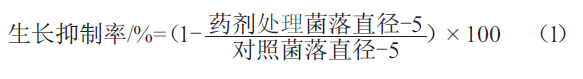 取測(cè)試藥劑,按照有效成分折算成一定質(zhì)量濃度梯度:0.05、0.1、0.2、0.4、0.8、1.6、3.2和6.4 μg/mL。使用PDA培養(yǎng)基(馬鈴薯20.0 g、葡萄糖20.0 g、瓊脂20.0 g、蒸餾水1 000 mL定容),將活化的菌株用打孔器制取5 mm直徑的菌絲塊,分別移到含有供試藥液培養(yǎng)基平板上,于25℃培養(yǎng)。待空白對(duì)照的菌落直徑達(dá)到培養(yǎng)皿直徑的90%左右,采用十字交叉法測(cè)量菌落直徑,按式(1)計(jì)算菌絲生長抑制率。
